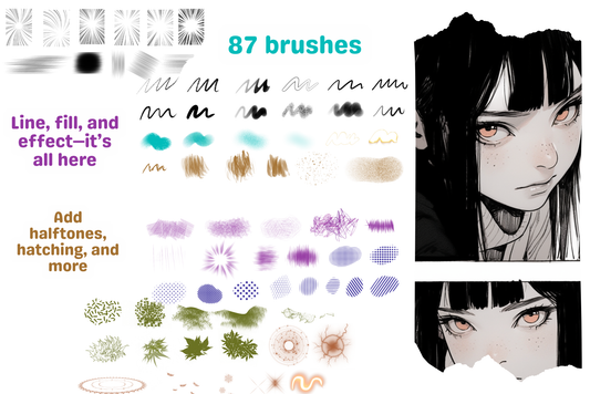 Procreate Manga Brushes Pack – 87 Brushes for Lineart, Shading, Foliage, Speed Lines, and Halftones